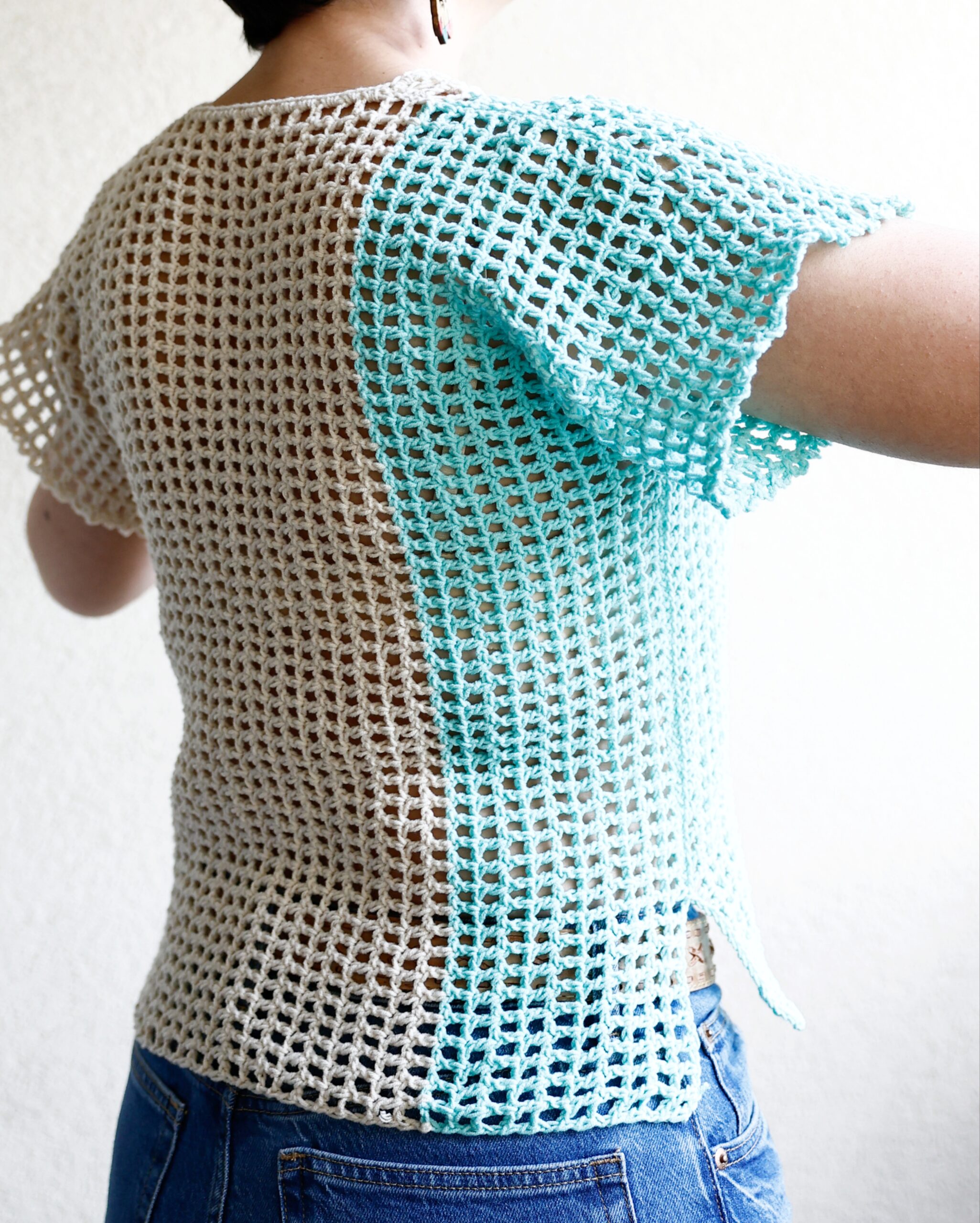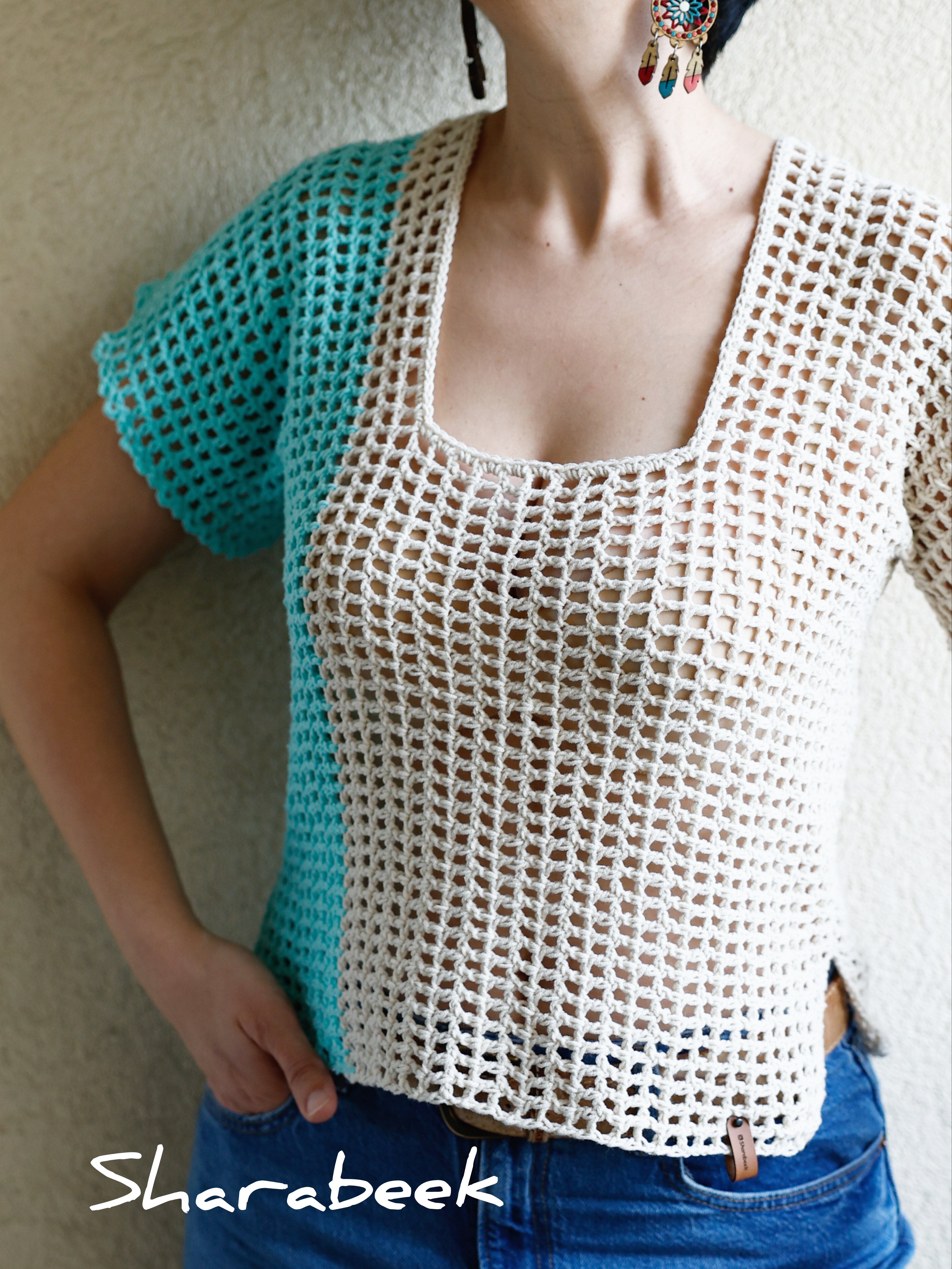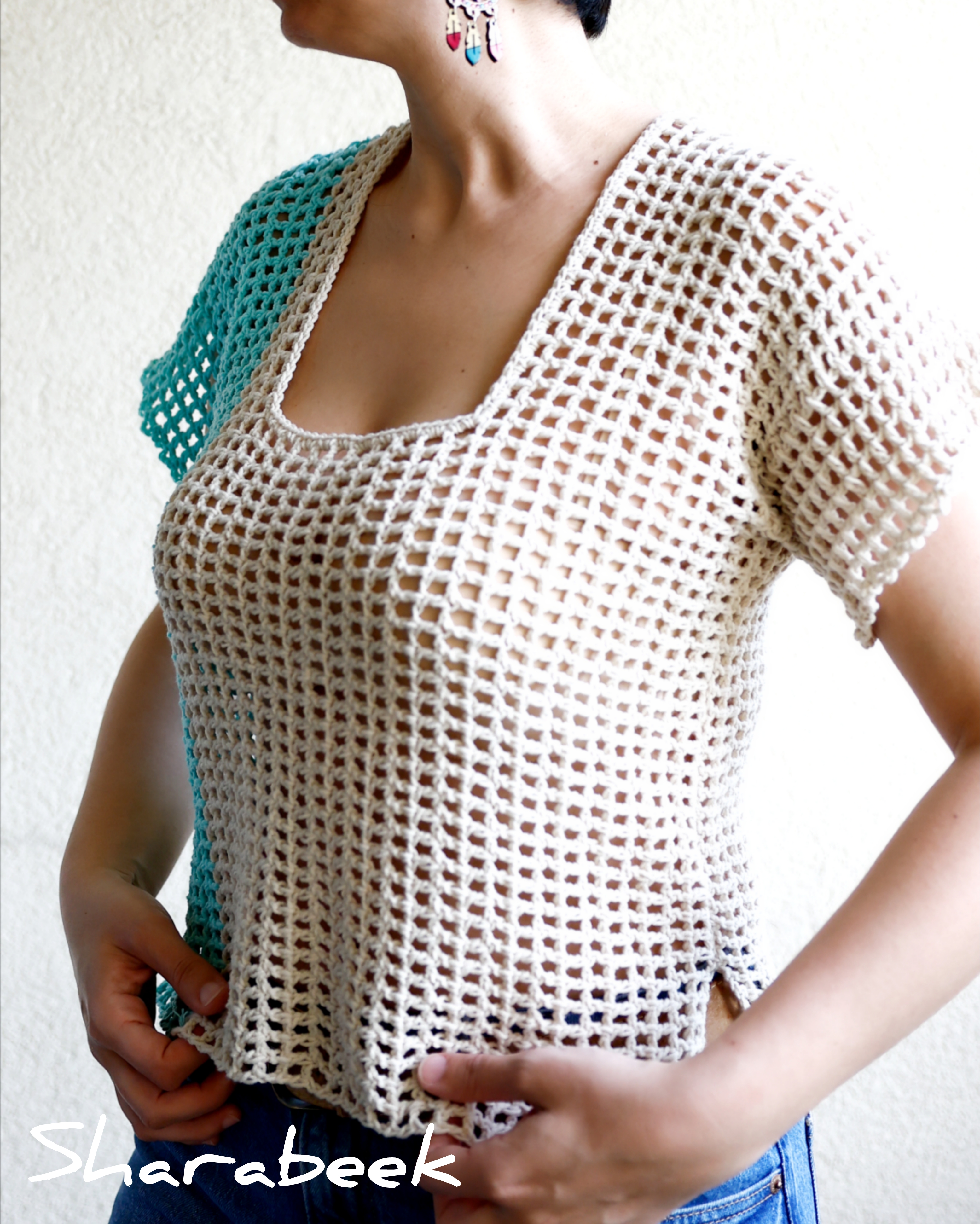 Top d’ete en crochet, tourqoise et beige , réalisé à la main à Paris.