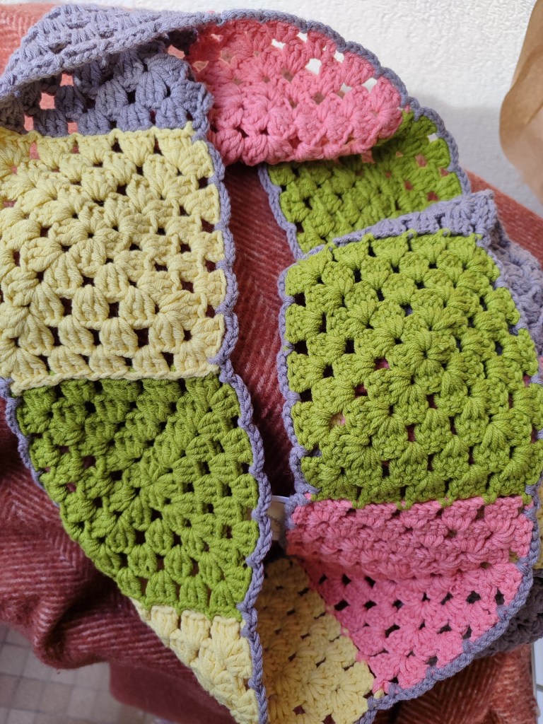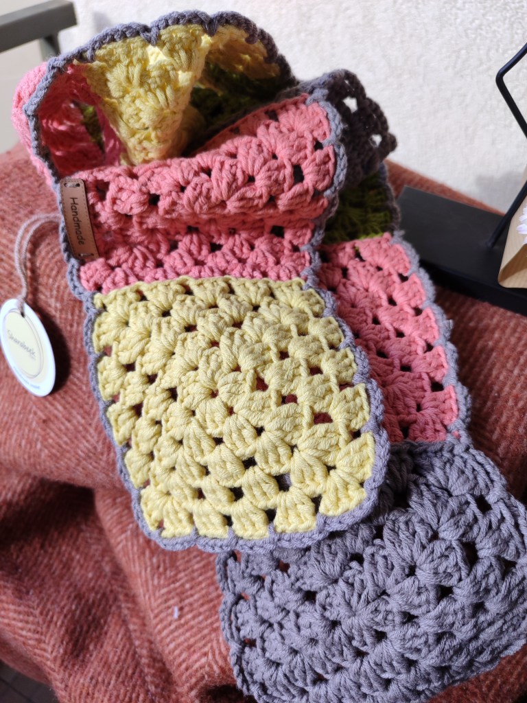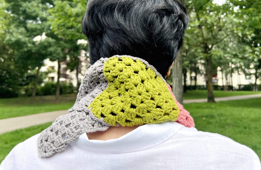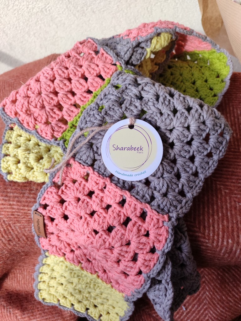 Ce châle est conçu à partir de carrés de (granny square) qui nous rappellent le passé et les grands-parents, mais nous l’avons conçu avec une vision moderne pour les amateurs de mode.