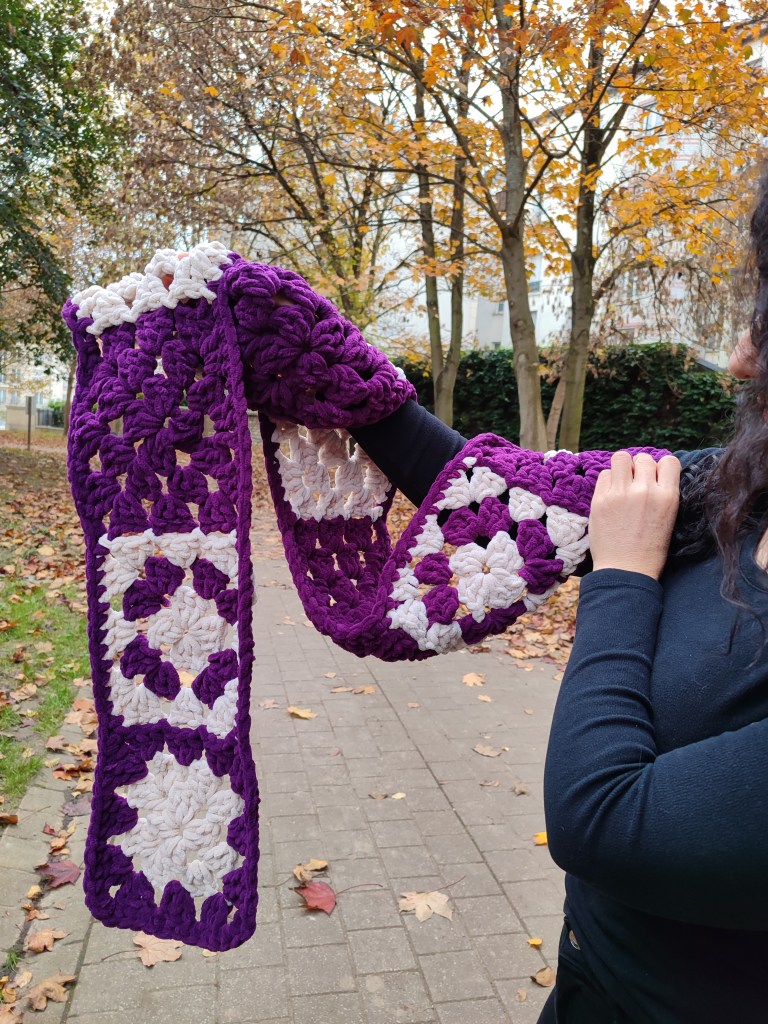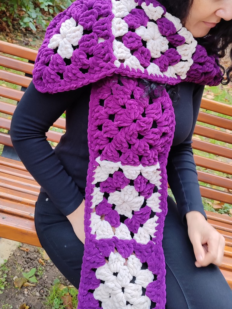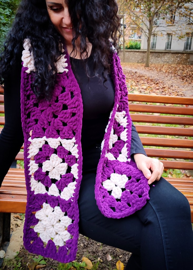 Châle fait à la main en crochet, unique en son genre, en fils de velours doux, léger, doux et chaud au toucher et très doux pour la peau. Sa couleur est spécifique et vous ne trouverez pas d’équivalent pour son design, sa couleur et la haute qualité artisanale avec laquelle il a été fabriqué.