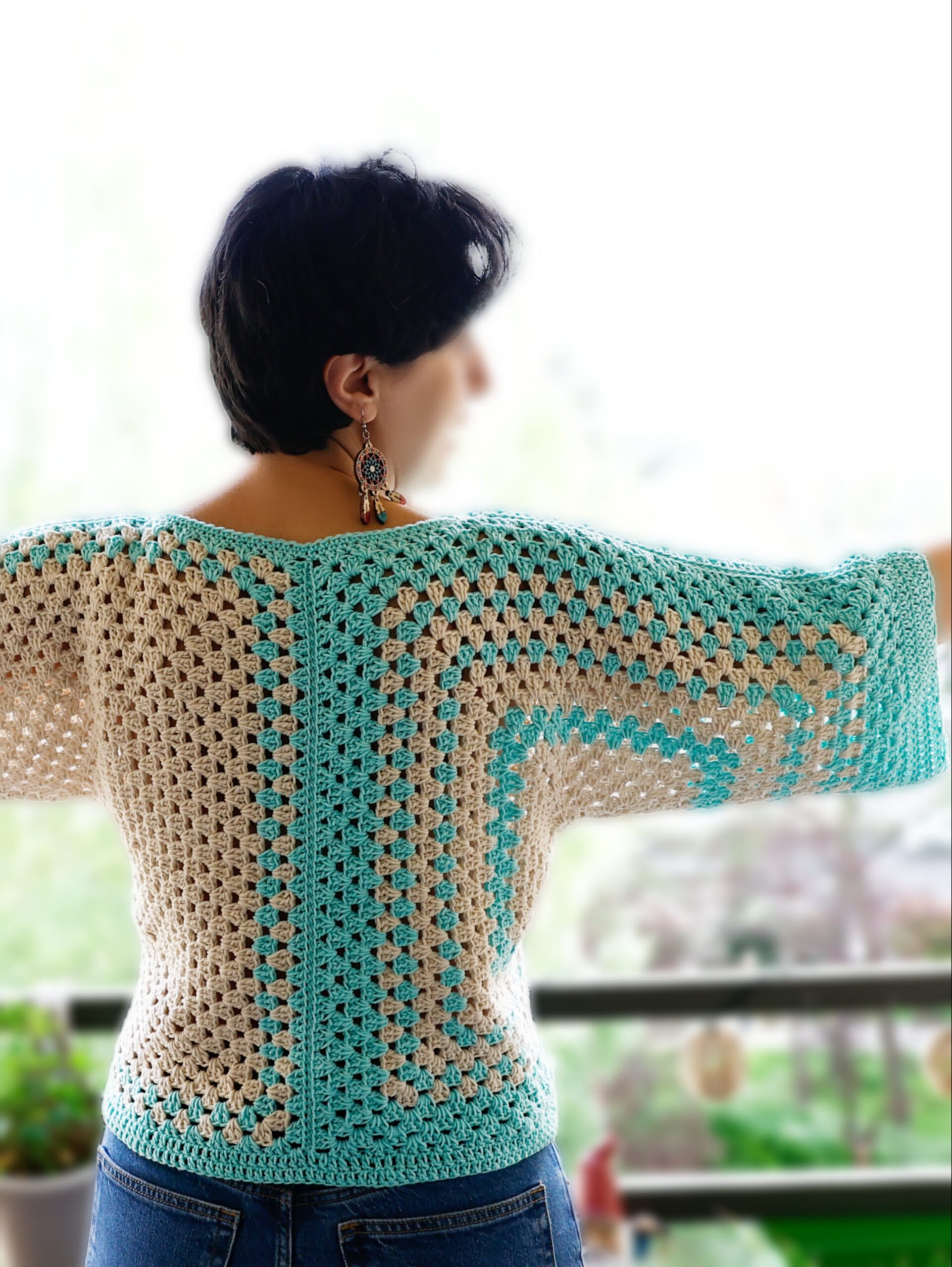 Taille : L/XL : (la mannequin mesure 173cm et porte une taille L). Longueur depuis l’épaule : 51cm. Largeur entre l’aisselle droite à l’aisselle gauche: 53cm. Largeur du manchon: 23cm.