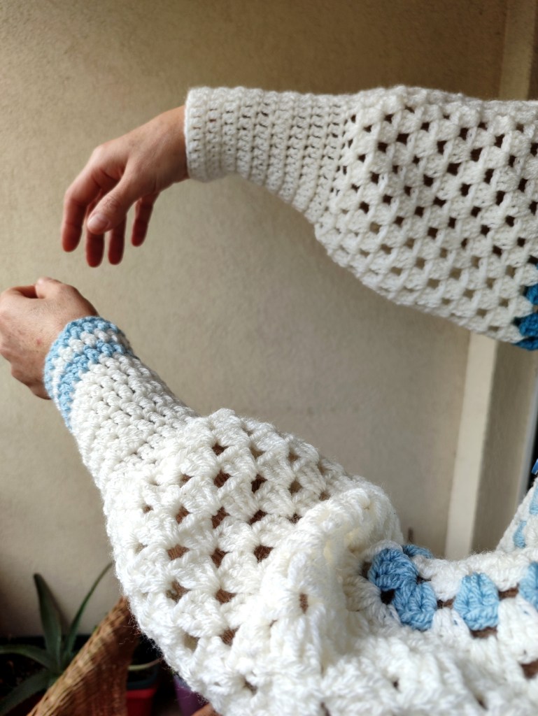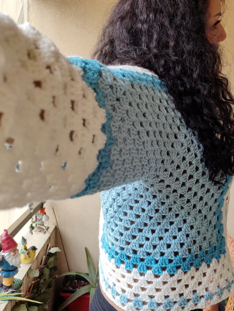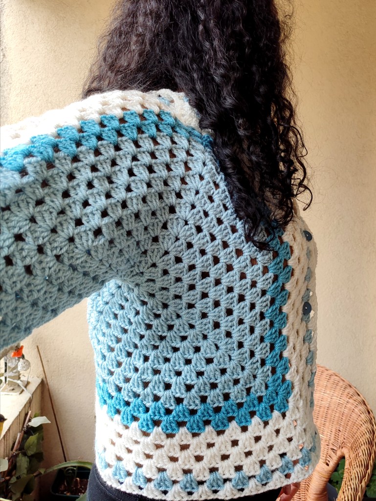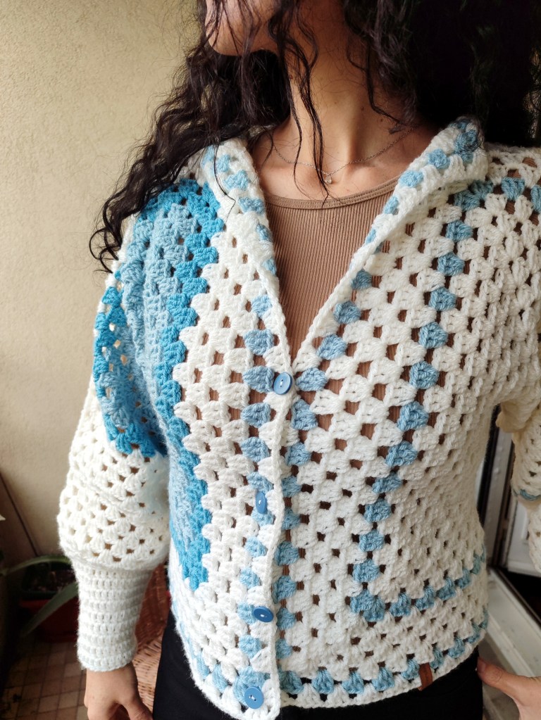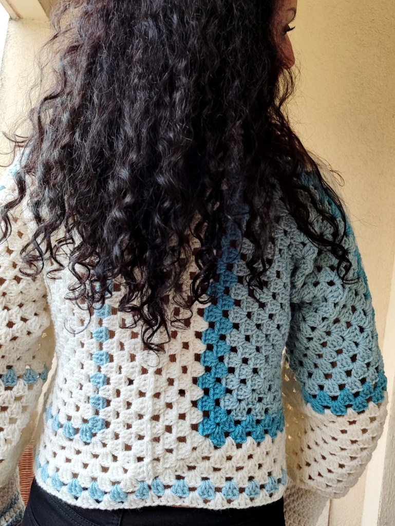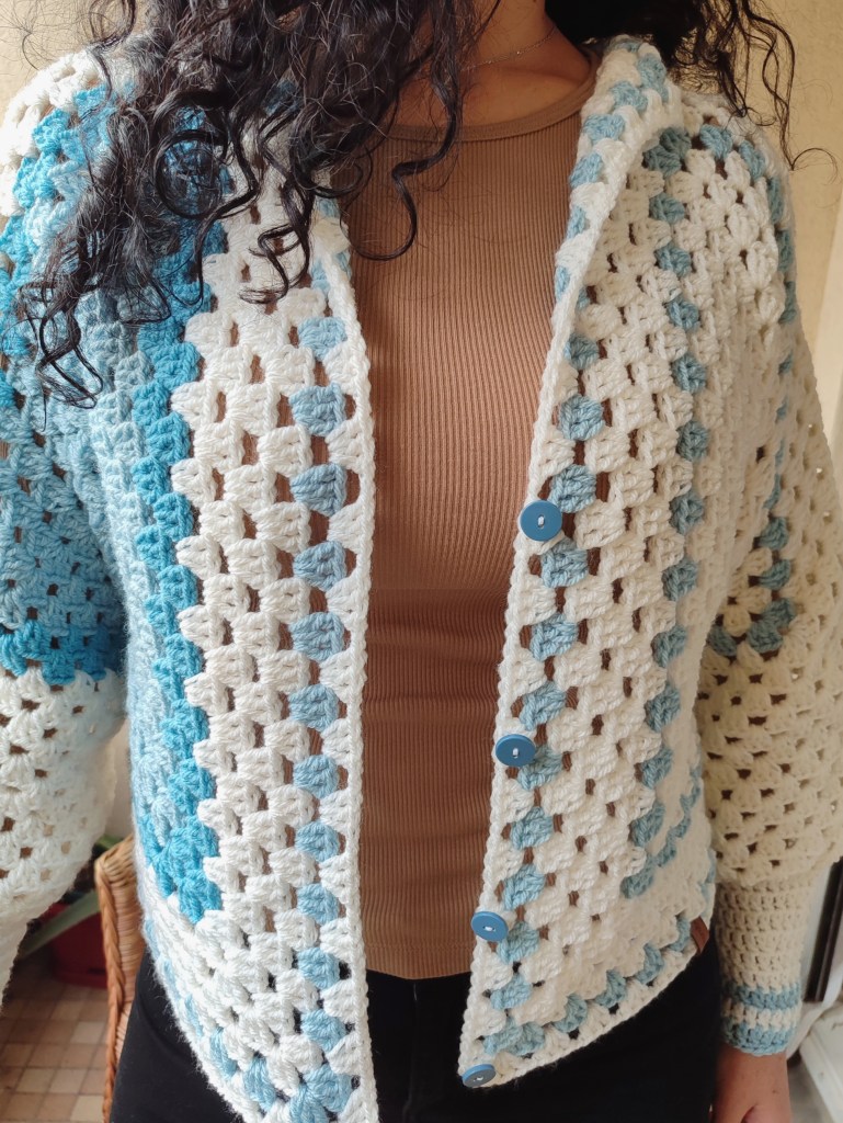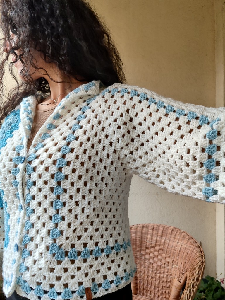 Cette magnifique veste est fabriquée à la main à partir de fils de haute qualité, conçu et crocheté sous forme de carrés imbriqués.