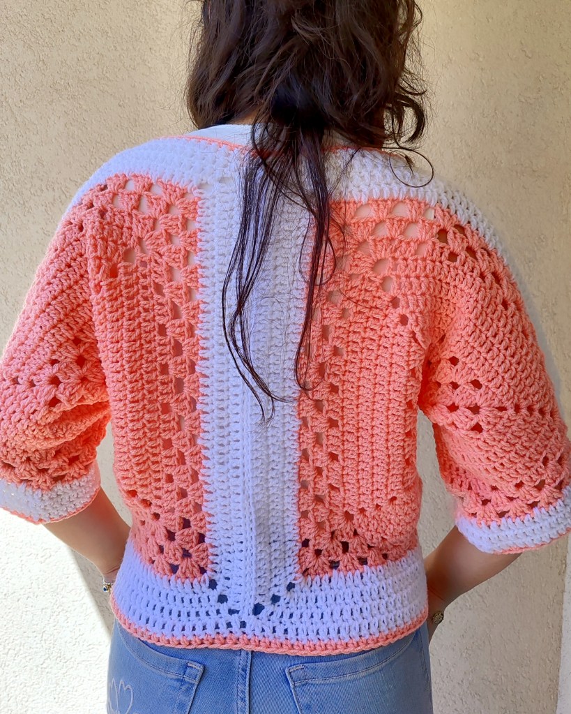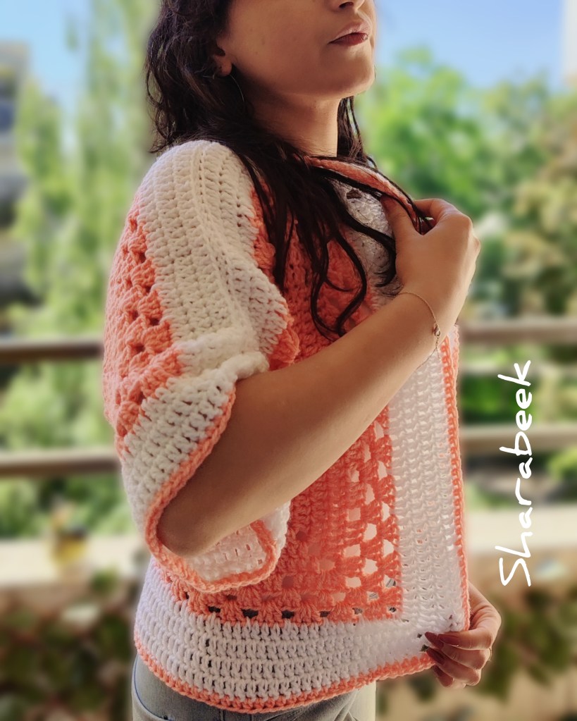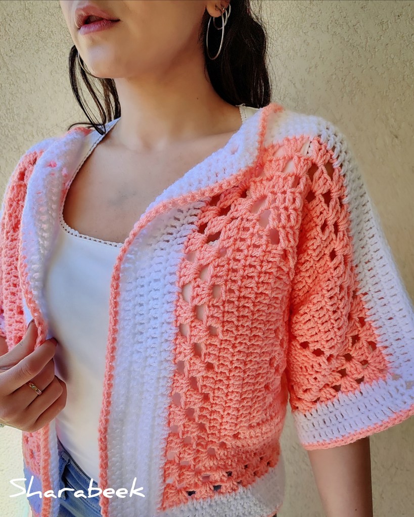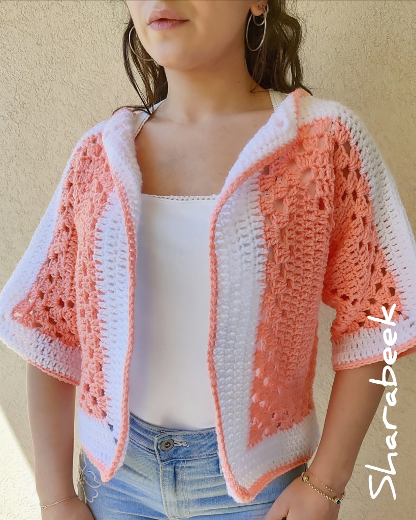 Cette magnifique veste est fabriquée à la main à partir de fils de haute qualité, conçu et crocheté sous forme de carrés imbriqués.