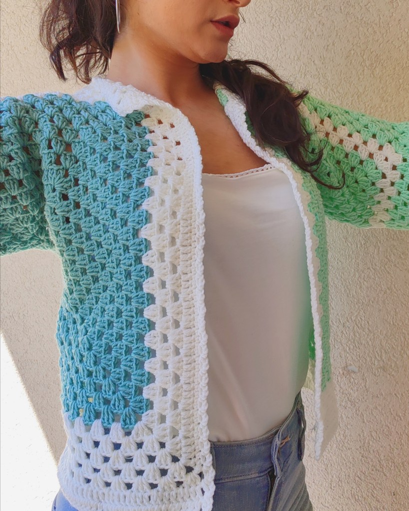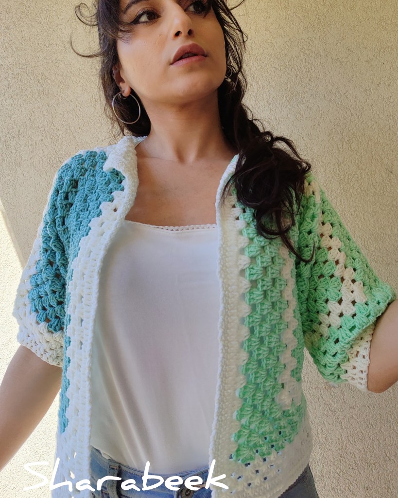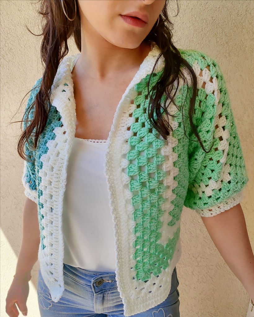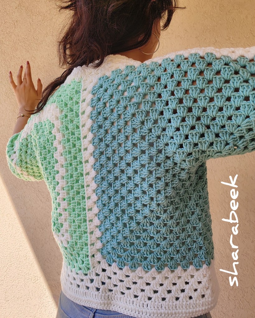 Cette magnifique et unique veste est fabriquée à la main à partir de fils de haute qualité, conçu et crocheté sous forme de carrés imbriqués.
