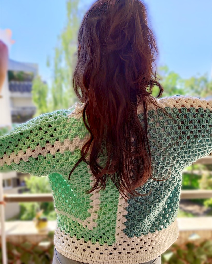 Une veste faite à la main inspirée par les feuilles des arbres au printemps et les nuances de vert lorsque les feuilles commencent à tourner.