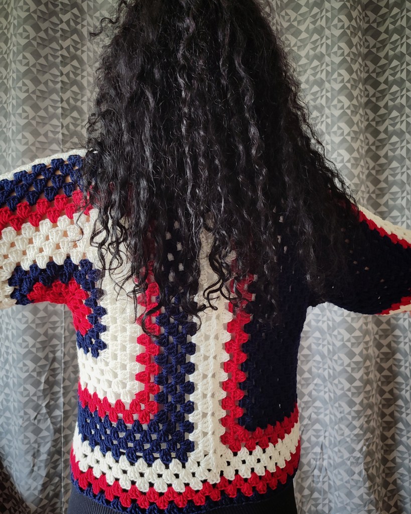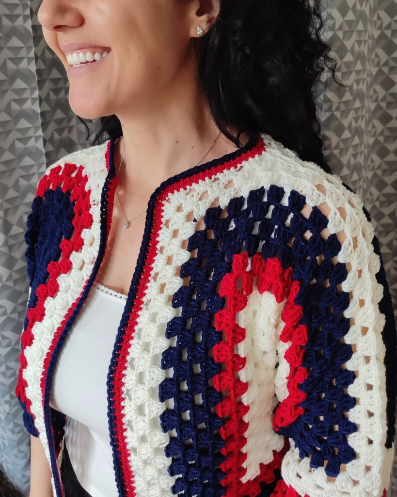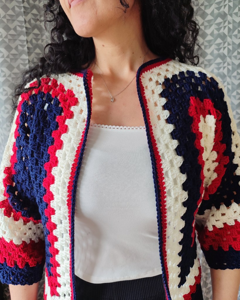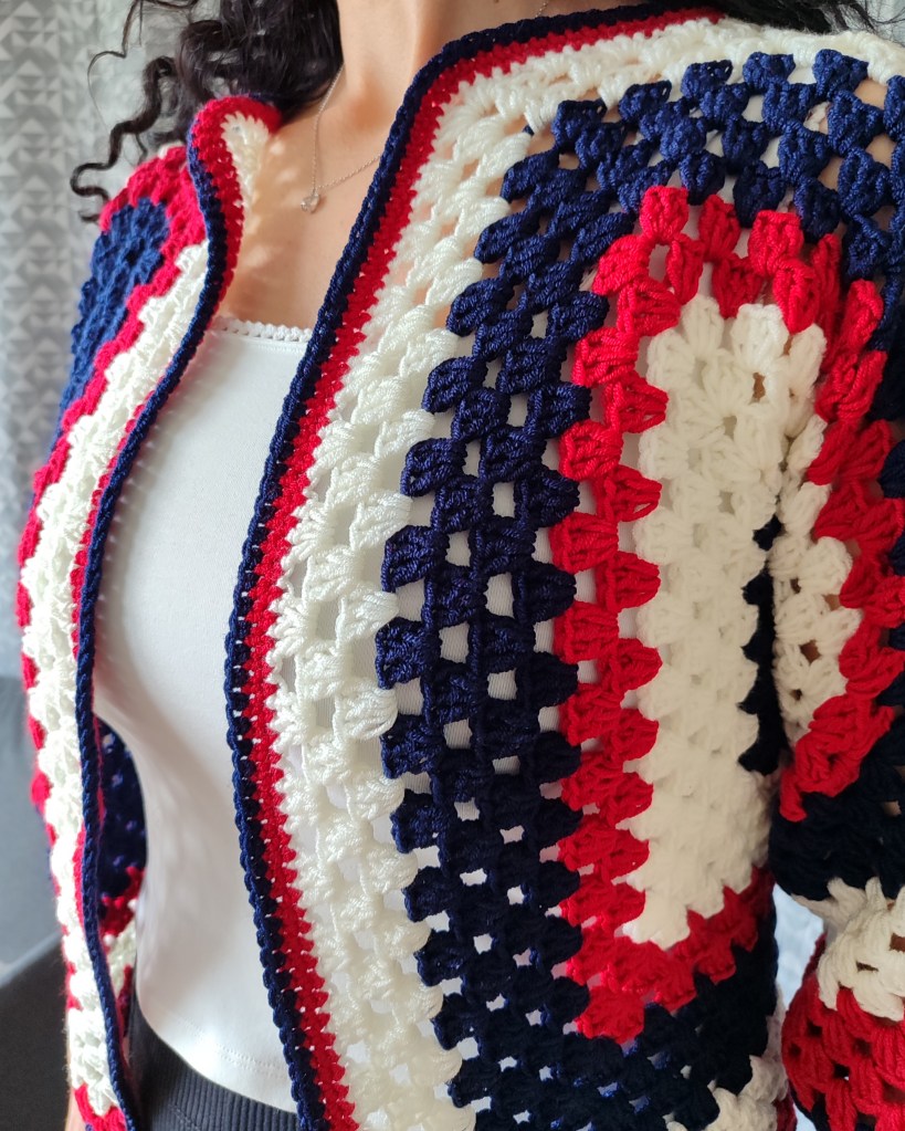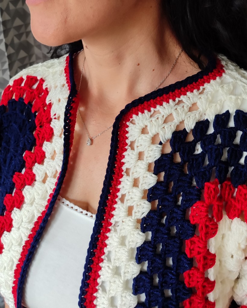 Cette magnifique veste est fabriquée à la main à partir de fils de haute qualité, conçu et crocheté sous forme de carrés imbriqués.